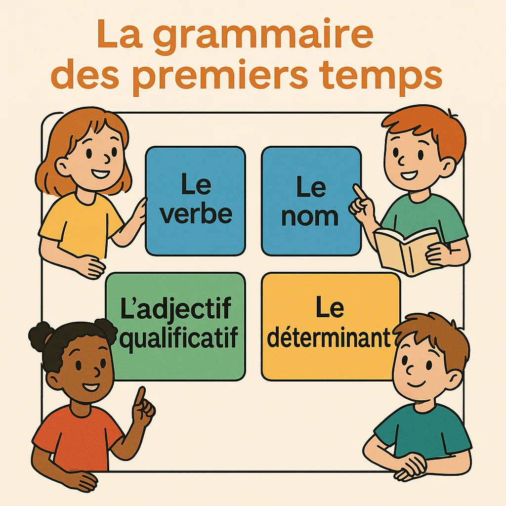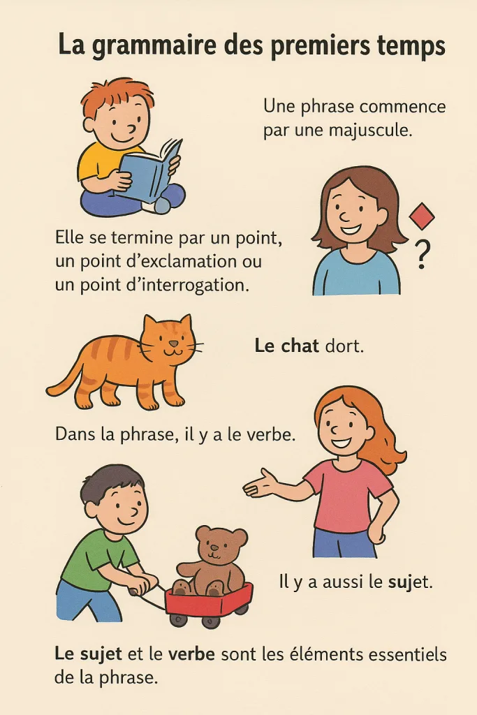 La grammaire des premiers temps regroupe les bases indispensables : la phrase, les articles, les adjectifs, les verbes essentiels, l’accord sujet-verbe et la négation.