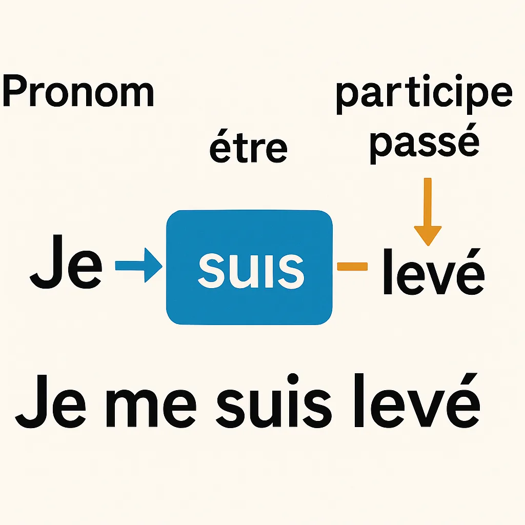 Donc on retrouve toujours le petit pronom me, te, se, nous, vous, se devant l’auxiliaire.