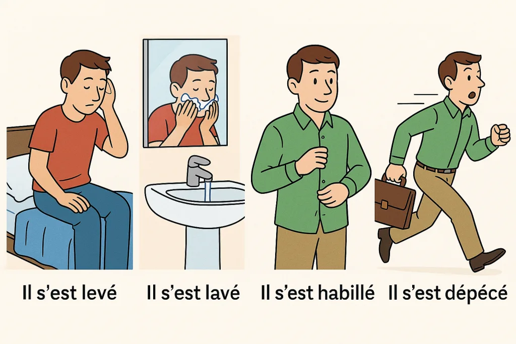 Exemple : « Hier, je me suis levé(e) tard, puis je me suis préparé(e) rapidement… »