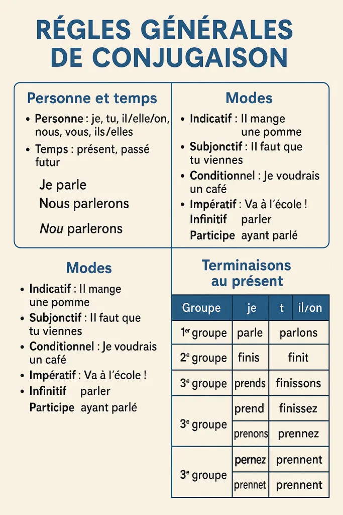 Cet article a pour objectif de présenter de façon claire et progressive les règles essentielles de la conjugaison française, illustrées par des exemples concrets, des tableaux de synthèse, ainsi que des exercices pratiques corrigés et un QCM .